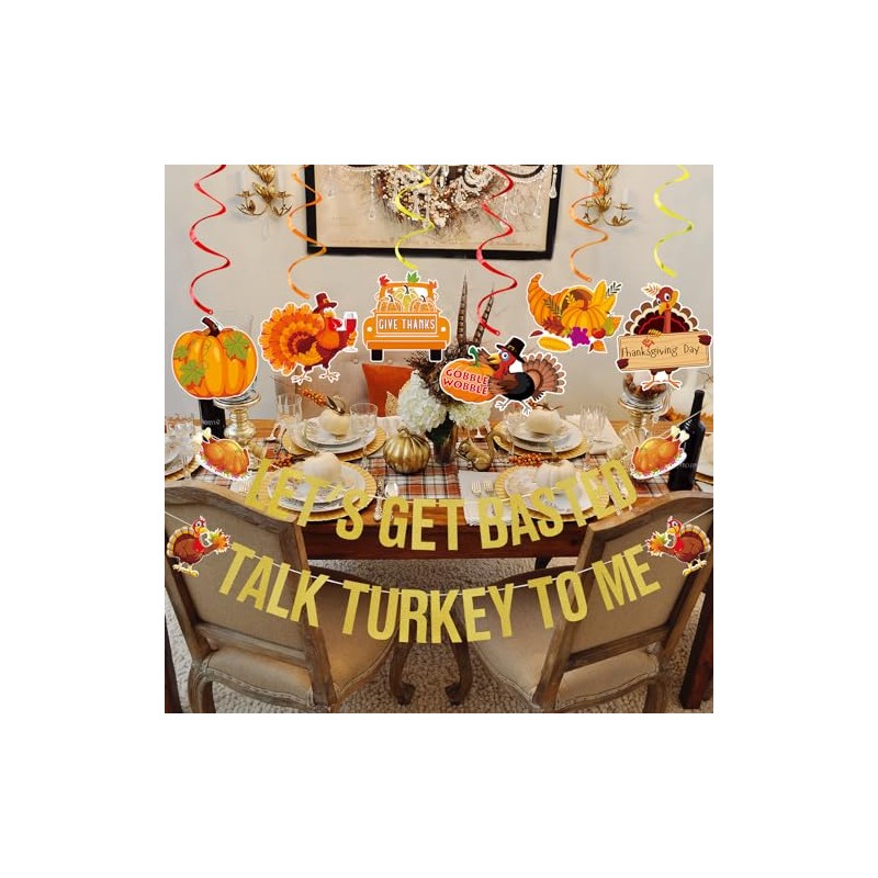 - What you will get: 1Pcs gold glitter Let's Get Basted banner, 1pc gold glitter Talk Turkey To Me banner and 6pcs happy Thanksgiving hanging swirls,full of Thanksgiving festival feeling.It is a must-have garland decorations to celebrate your Thanksgiving dinner party,brighten up your home party,express your joy for the upcoming Thanksgiving.