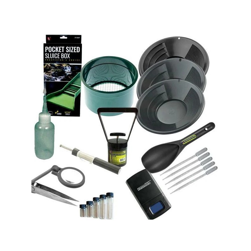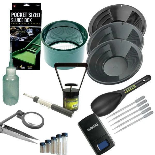 Gold Panning Kit Set 12" 10" 8" Black Gold Pans Mini Pocket Sluice Box & More