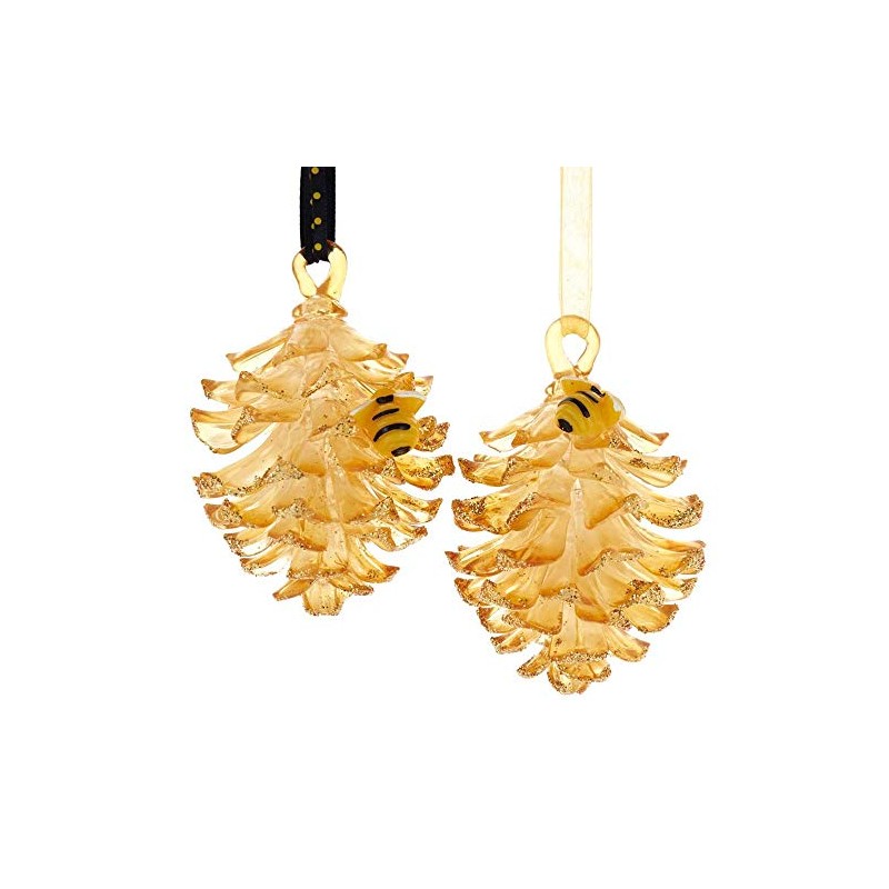 - 3.5-Inch Plastic Gold Pinecone with Bee Ornaments. 2 Assorted: One of Each