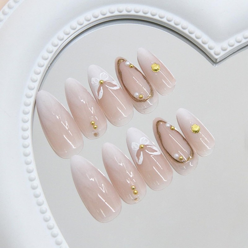 Gold Press on Nails Medium Almond Fake Nails 3D Seashell Butterfly Design Stick on Nails White French Tip False Nails Gradient Full Cover Acrylic Glue on Nail for Women Manicure 24Pcs