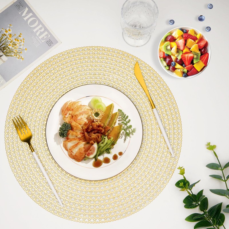 • Design: This gold round placemat with hollow out heart motifs make the whole placemat luxurious and cozy. Ideal for dressing up tables, kitchens and dining rooms, whether for everyday meals or special holidays.