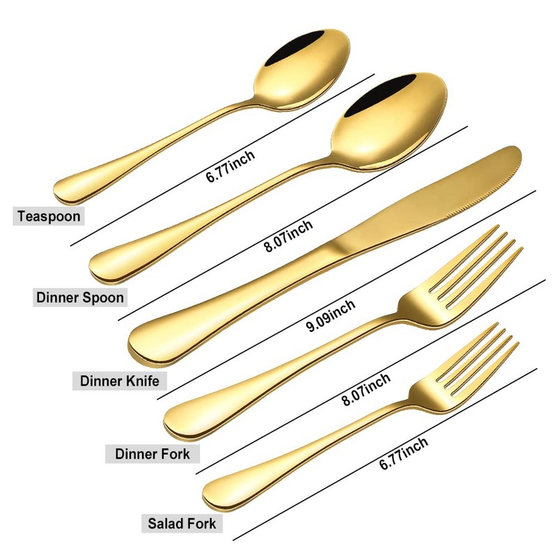 - Glossy Metallic Gold: Gold spoons and forks set has luxury shinning gold mirror finish looking, will not easy fading,stainless steel flatware demonstrated your elegance dining tastes, a nice fashionable addition and well match your tableware with this gold kitchen utensils.