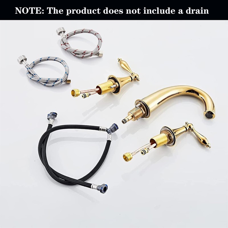 Beelee Gold Solid Brass Widespread Bathroom Faucet 3 Hole Two Handle Deck Mounted Faucet High Arc Lavatory Sink Taps with Ceramic Valve and 2 Hoses, Without Drain