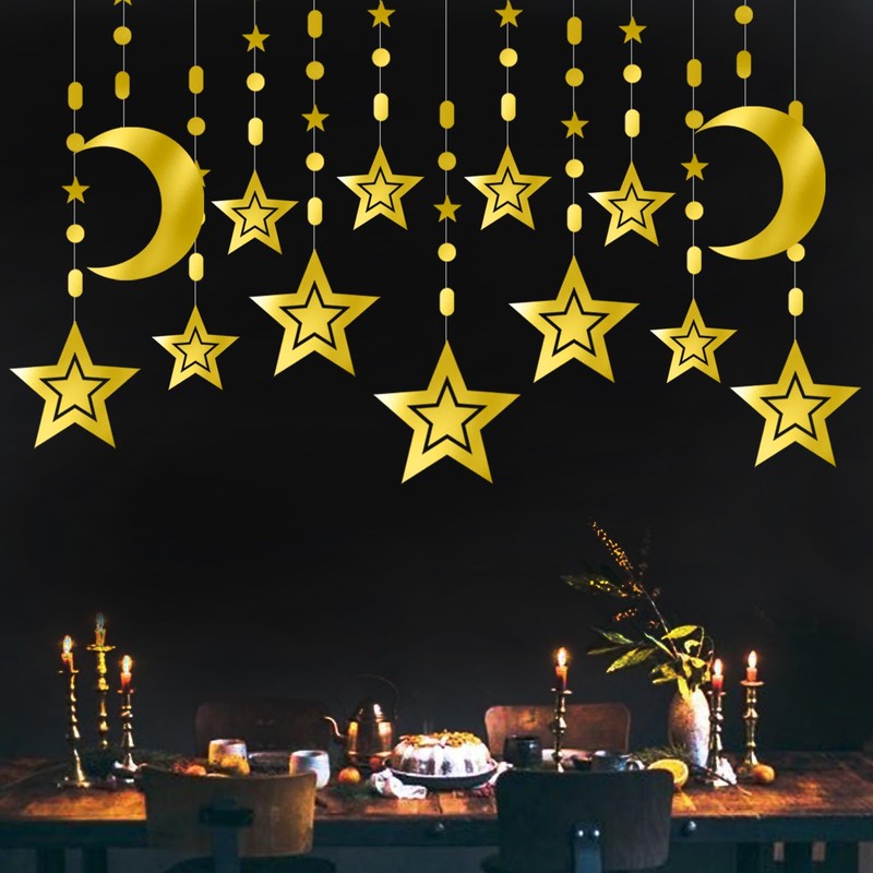 - 【Package Contains】12 strings 90cm different shape gold streamers garland.11pcs star shape,2pcs moon shape.