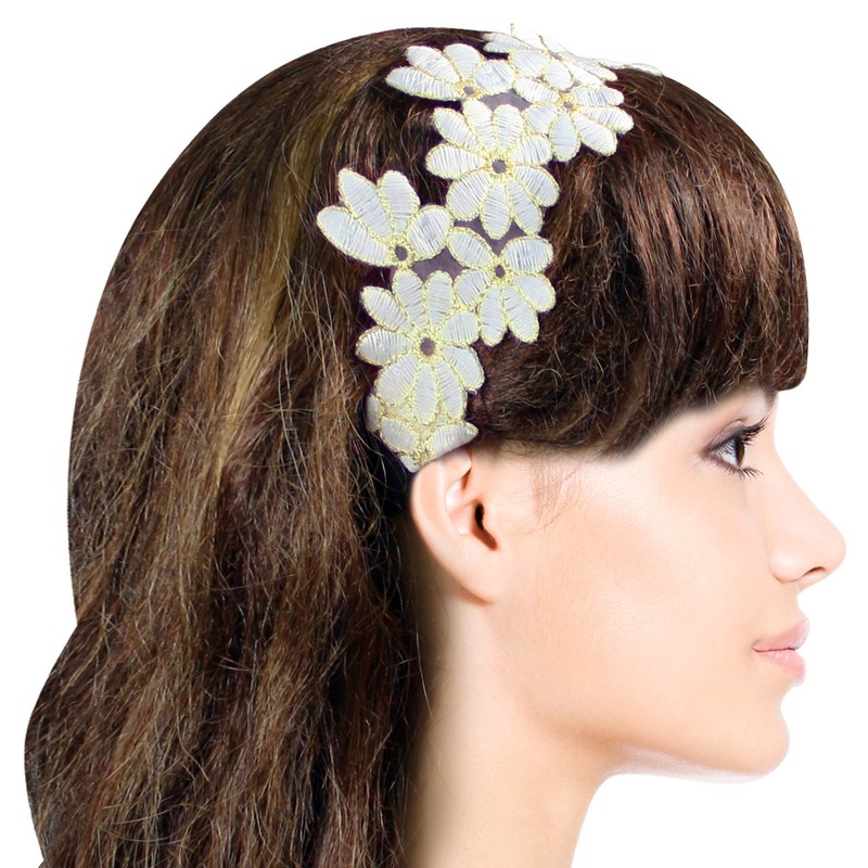 Gold-Tone Thread Flower Vintage Style Handmade Elastic Headband - White