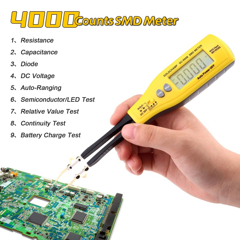 - 【Professional Precision SMD Component Testing】GC-990B SMD Tweezers Meter is an upgraded version of 990A, which can accurately measure resistance (400Ω-40MΩ), capacitance (5.12nF-200μF), diode and continuity. It is equipped with an auto-range LCD display and an accuracy of 4000 counts, which is ideal for PCB repair, electronic manufacturing and DIY projects