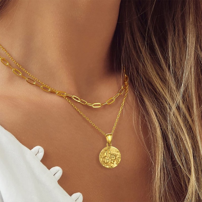 - πMATERIALS: This Coin medallion necklace with carved Chinese zodiac animal patterns.crafted in stainless steel and 5 times plated with 18 Karat Gold, Stainless steel jewelry will never tarnish or fade away. Stainless steel is also a great choice for someone whose skin is sensitive to metal. Also, it will not turn your skin green or any other color.