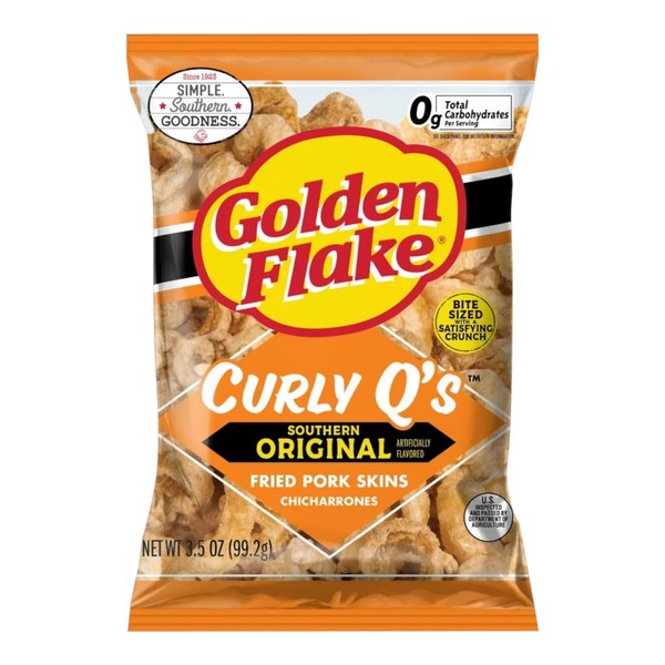 • Enjoy the classic flavor of Golden Flake and Experience Golden Flakes's delicious tradition of Southern goodness. Pork Skins, Pork Rinds, Chicharrones Curly Q shaped and cut Original great flavor. 0 g total carbohydrate per serving. 3.5oz each bag/3pk