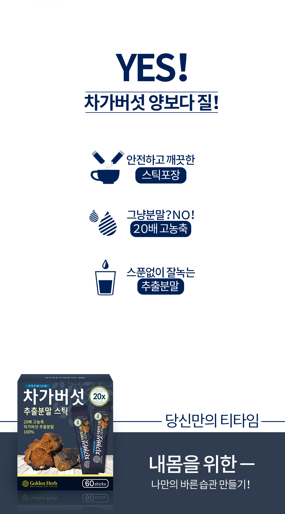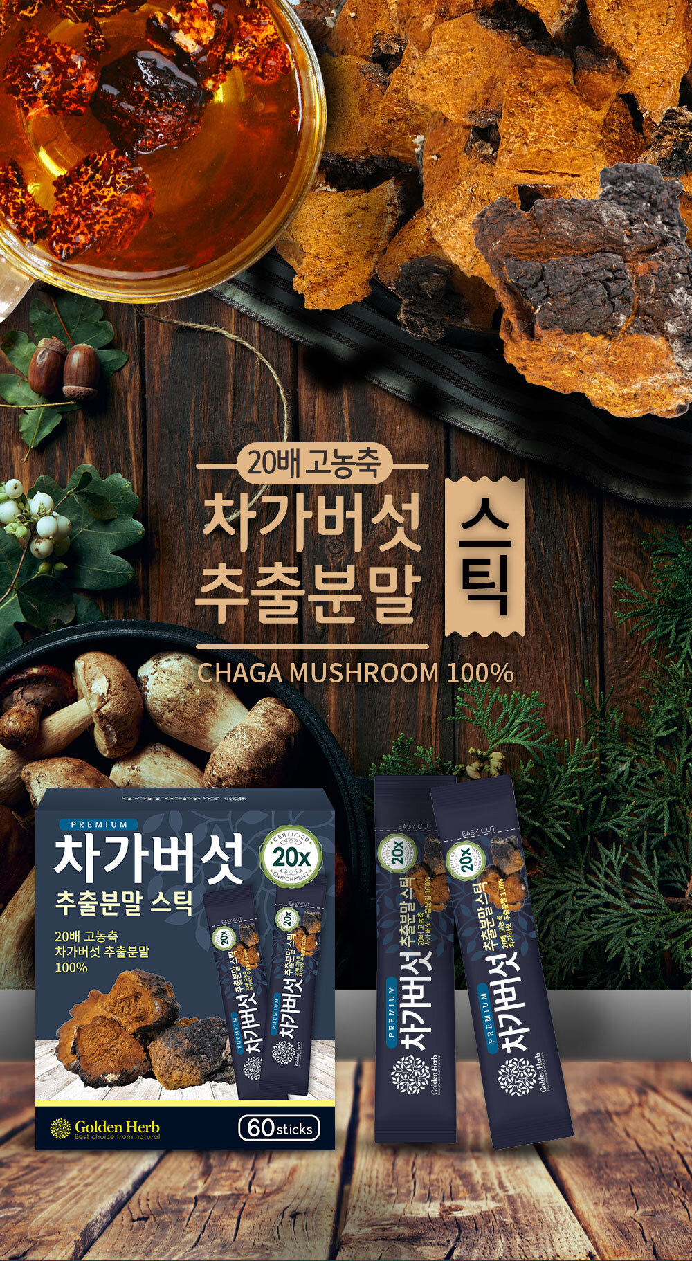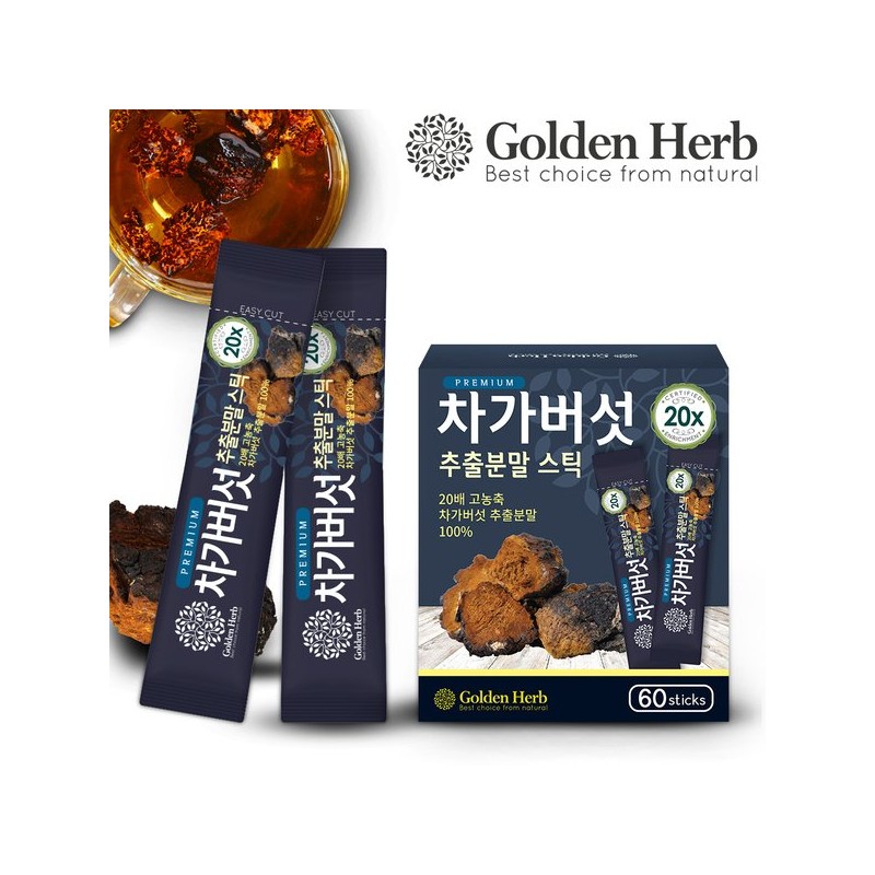 Golden Herb 20배 농축 차가버섯 추출 분말 가루 스틱 60포 20x Concentrated Chaga Mushroom Extract Powder Stick 60 Packs