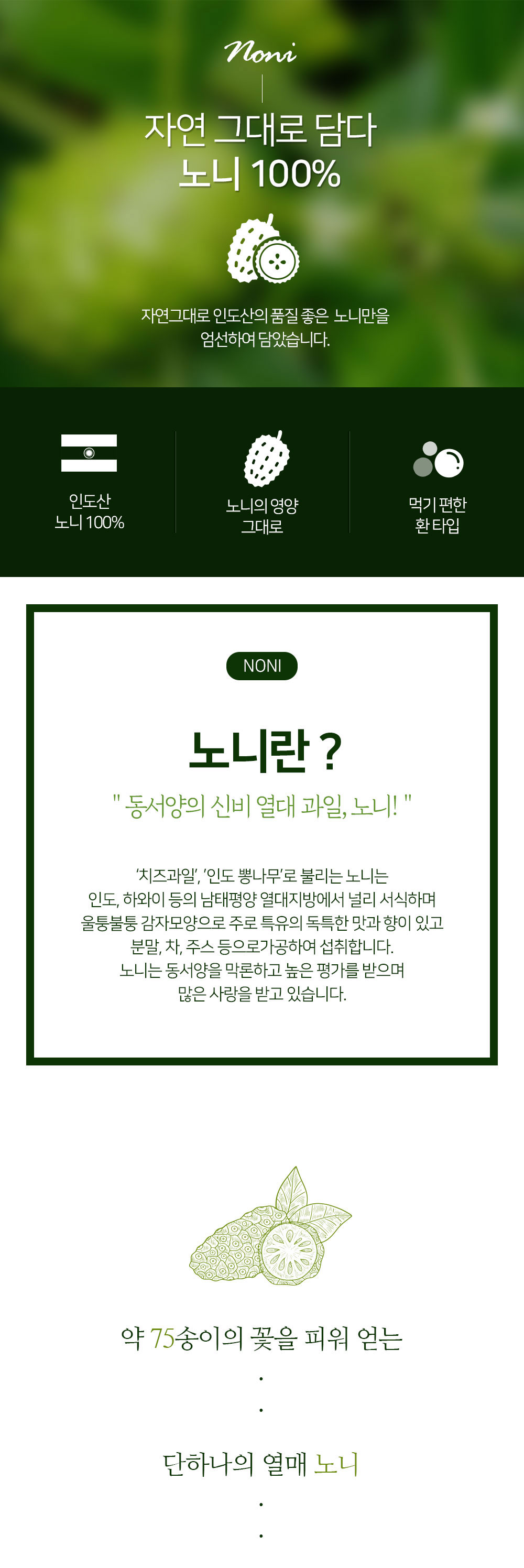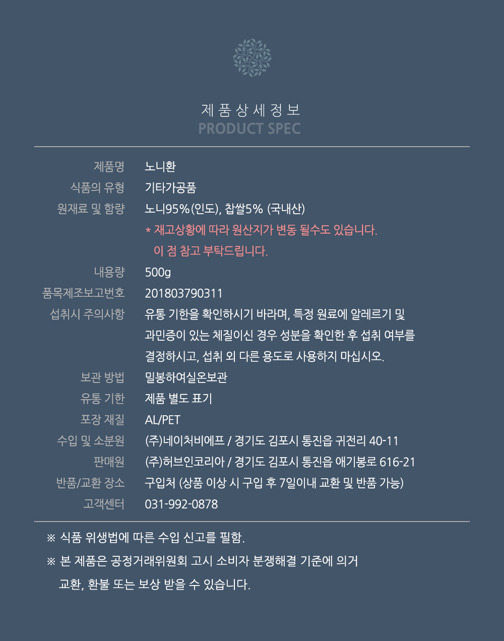 - Main Ingredients/Contents (Origin of Ingredients): Noni 95% (India), Glutinous Rice 5% (Domestic)