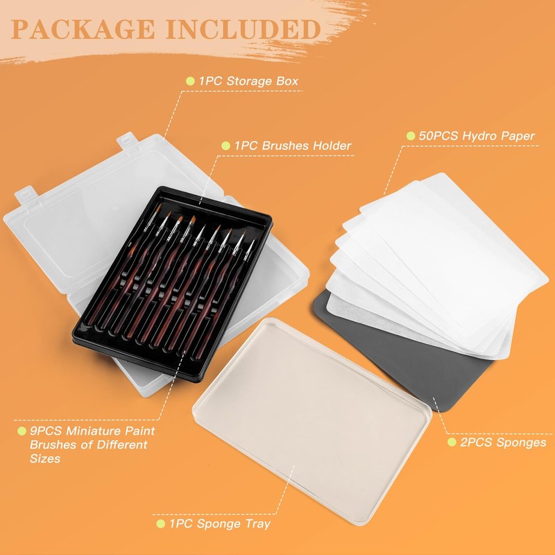 - What's in the Package: The wet pallete set includes 50 wet papers, 2 sponges, a tray, a brush holder, and 9 miniature paint brushes, all packed in a well-sealed case. It’s perfect for easy storage and portability, keeping your model paint brushes organized and clean.