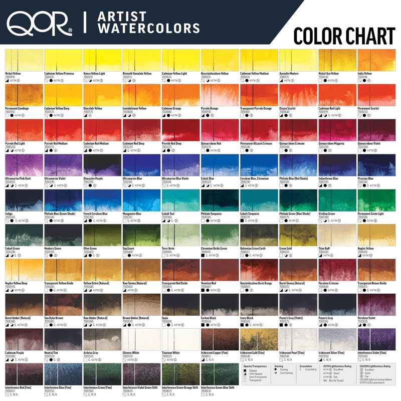 QoR retains the best qualities of traditional watercolours, while expanding the range and versatility of each colour. QoR's exclusive binder (Aquazol) provides a greater density of colour than conventional watercolours, offering vivid depth of colour with every brushstroke.