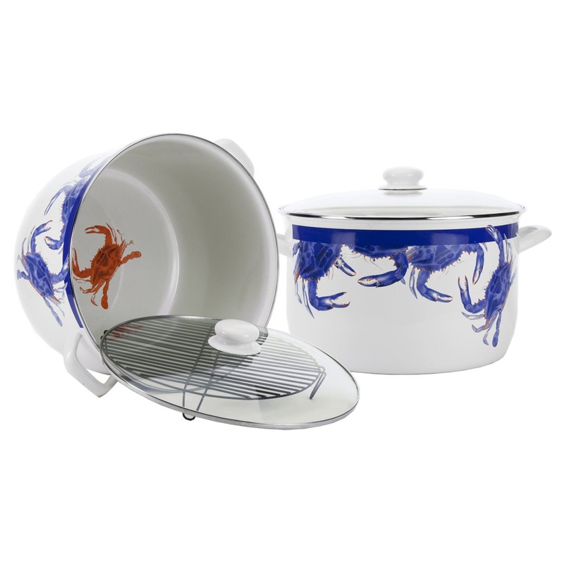 Golden Rabbit Enamelware - Blue Crab Pattern - 18 Quart Stock Pot with Rack