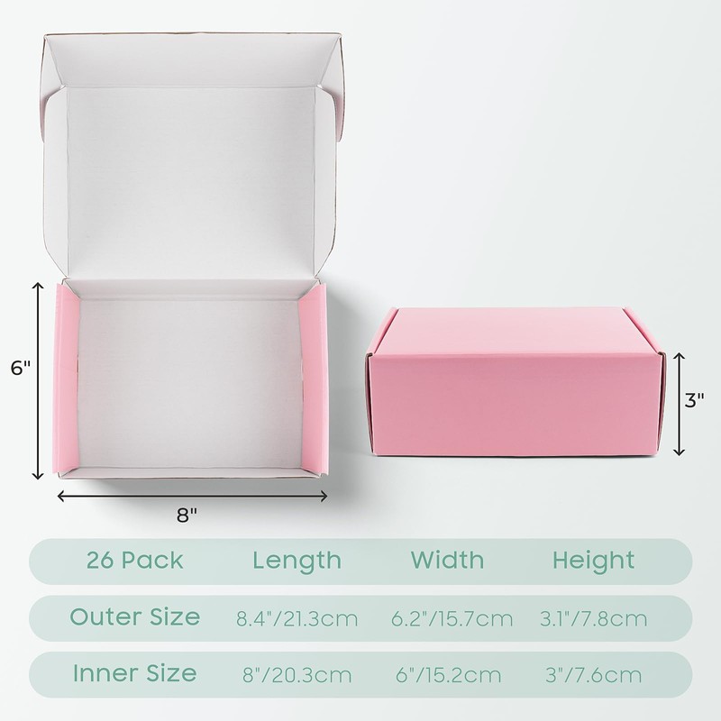 Golden State Art, 8x6x3 Pink Mailing Box, 26 Pack Sturdy Gift Box Mailers Small Business, Shipping Supplies Cardboard Corrugated Packing