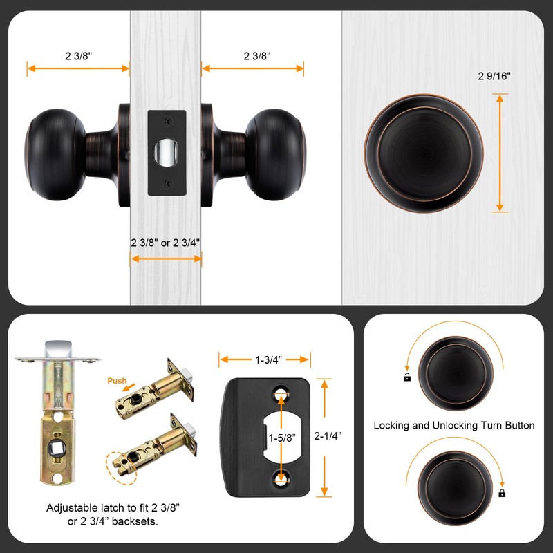 - ADJUSTABLE LATCH - Adjustable latch to fit 2 3/8" or 2 3/4" backsets. Fits on 1 3/8" to 1 3/4" thick doors. Please measure the door thickness and backsets before purchasing.