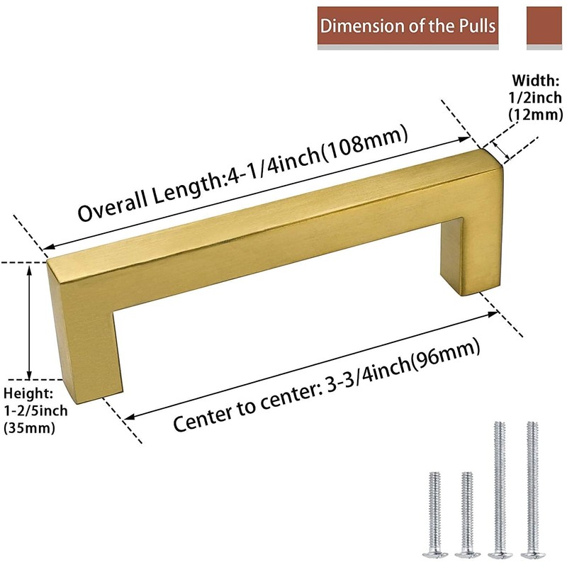 - SQUARE STYLE: goldenwarm modern square cabinet handles with brushed brass finish; Quite decorate your home. Suitable for different styles of cabinets, use these gold hardware to decorate your cabinets or update some old furniture, bring you a modern look.