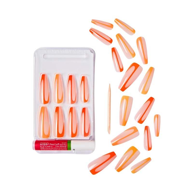GoldFinger Trendy False Nails Kit, X-Long Coffin Design Nail, Minimal Tropical Orange & Yellow Print, Ready to Wear Gel & Manicure Stick included, Long-Lasting Convenient & Easy to Apply