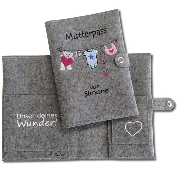 - The inscription on the front, as well as the name of the expectant mum are embroidered in high quality. Two inner compartments with loving inscription provide enough space for ultrasound images and the health insurance card.