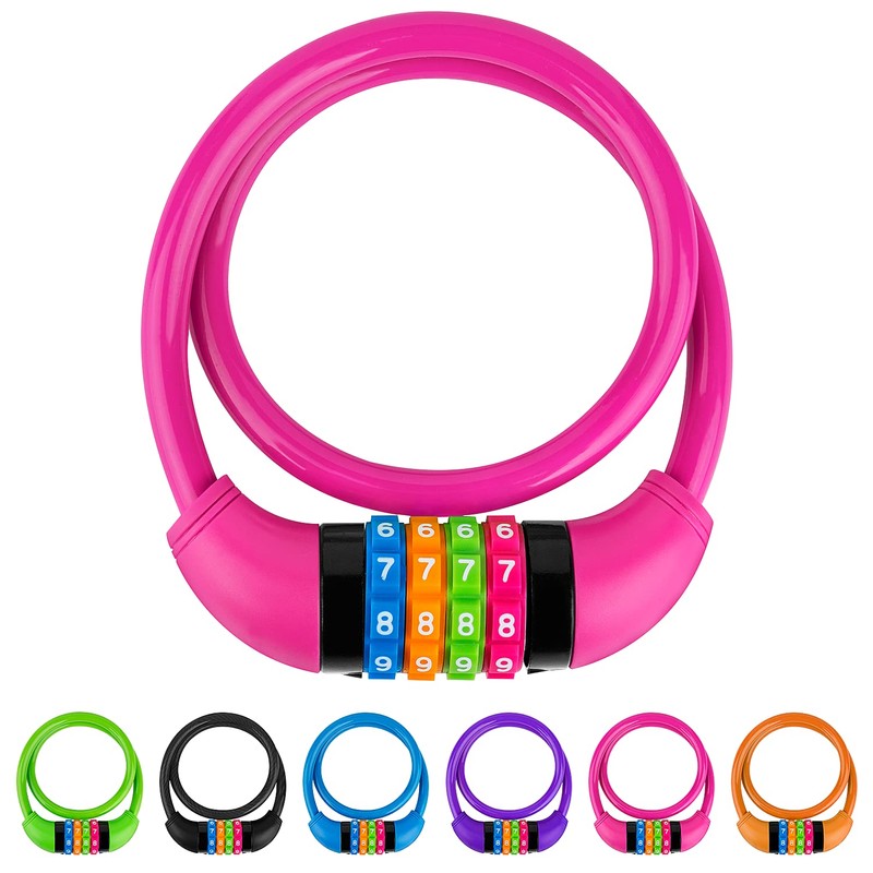 GOLDPOOL Children's Bicycle Lock Colourful Combination Lock Bicycle Bicycle Lock with Numbers, 650 x 11 mm, Cable Lock Code Combination, Pink Children's Bicycle Lock, 4-Digit, Resettable Combination