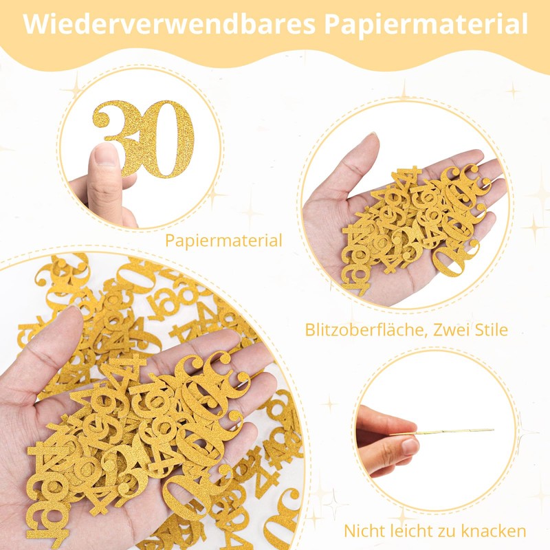 - Table decoration for 30th birthday man and woman: GoldRock confetti 30th birthday decoration contains a total of about 100 pieces of confetti. It contains two classic elements: the number 30 (approx. 2.6 cm x 3.4 cm) and the number 1994 (approx. 1.9 cm x 4.9 cm). The confetti is large and rich. Ideal for 30th Birthdays of men and women, 30th Wedding Anniversaries, 30th Company anniversaries, baby showers, home decorations, golden wedding 30 and other table decorations.