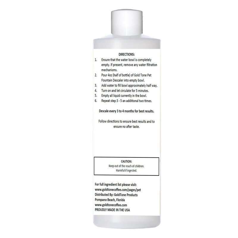 - 🐈 DESCALER - Made in The USA. Your pet deserves that best tasting water possible. Give them that by descaling their fountain regularly. GoldTone Pet Fountain Descaler is designed to remove buildup from your fountain that can cause bad tastes. Improves taste and increases the longevity of your fountain.