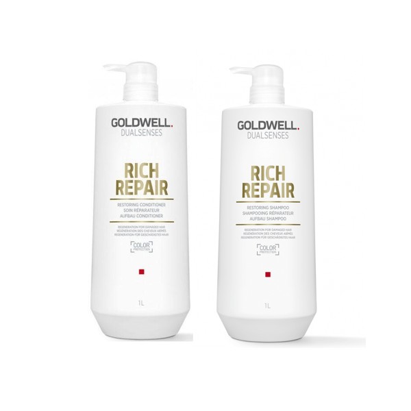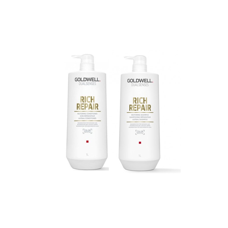 What are the benefits and features of Goldwell Dualsenses Rich Repair 1 Litre Shampoo and Conditioner Bundle?- Instantly reconstructs and reawakens the shine of natural hair.