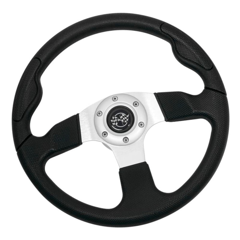- UNIQUE DESIGN: This steering wheel features a sporty 3-spoke design with rivet-accented checkered flag motif at center (horn button is decorative and nonfunctional)