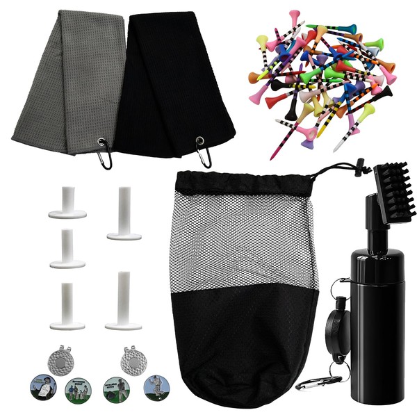 - What Will Receive: You will receive a convenient and complete golf towel and brush set, including pcs golf towels, a brush with a retractable zip line, and 55pcs of golf tees. And 6 remarker, a Mesh bag.
