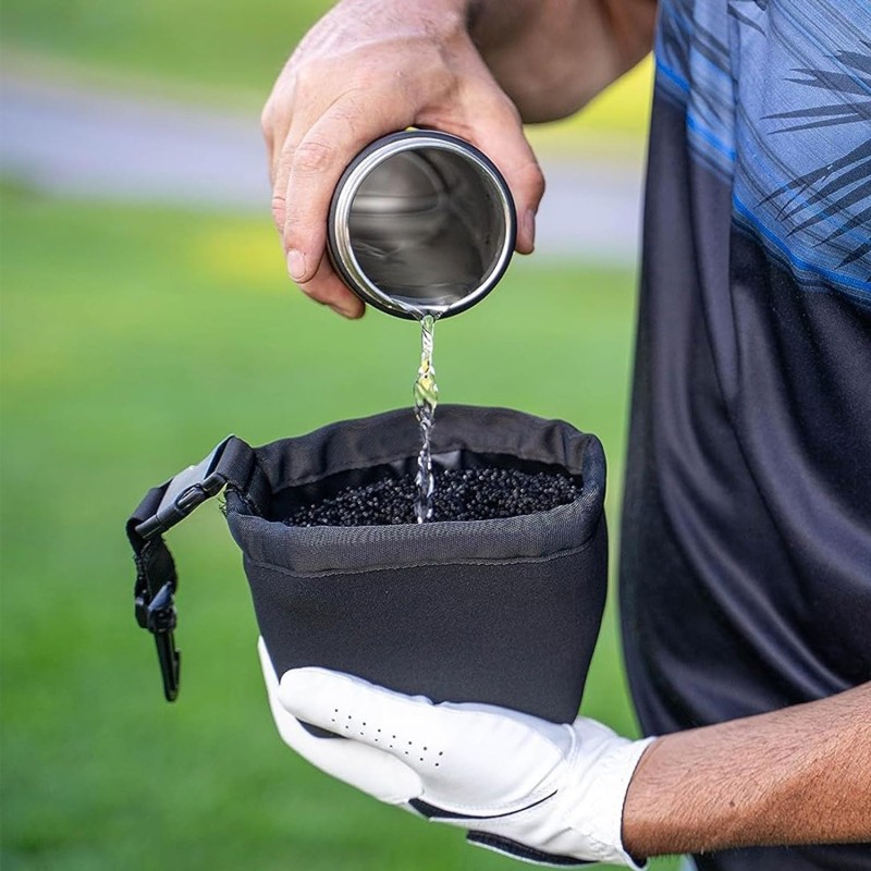 • Compact Design This golf ball grooming bag is small and handy, so you can take it anywhere. It doesn't take up much space in your golf bag or golf cart and sits comfortably in your hand while scrubbing your balls