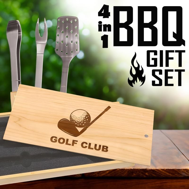 - Stylized Golf Club Set: Aim for the perfect grill session with a set engraved with "GOLF CLUB" below a stylish depiction of a golf club behind a golf ball. Ideal for those who appreciate the finer details in both golf and grilling.