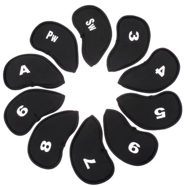 Golf Iron Covers Headcovers Zipper Closure (3-9, A, Pw, Sw) Number Protective Cover Flexible Waterproof 10 Pack Black