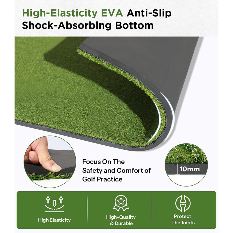 • 【Superior High-Elasticity EVA Anti-Slip Bottom】The golf hitting mat thickened shock-absorbing EVA foam bottom can not only protect your clubs and wrists but also can easily withstand any shots without tearing and wearing. It provides maximum stability on any surface, indoors or outdoors