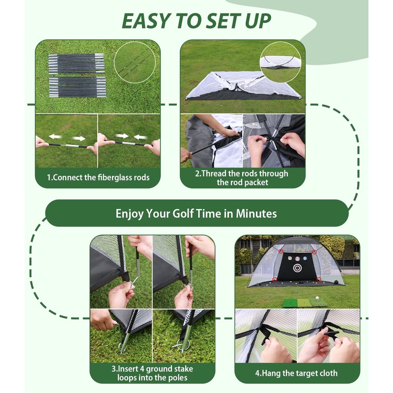 - 【Easy to Assemble & Portable】Our golf net comes with step-by-step instructions and the necessary components and can be easily set up and disassembled in 3-5 minutes. Whether you're indoors in the living room or garage, or outdoors in garden, you can set up the golf practice net and mat with ease, regardless of the weather or location. Additionally, the included tri-turf mat is foldable, allowing to pack all accessories into the equipped carry bag for effortless carrying and storage