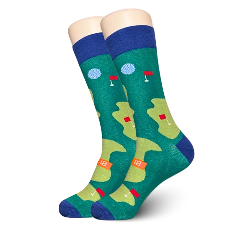 - DESIGN FEATURES: Vibrant green and navy blue crew socks featuring a playful golf course layout pattern with golf balls and flag designs
