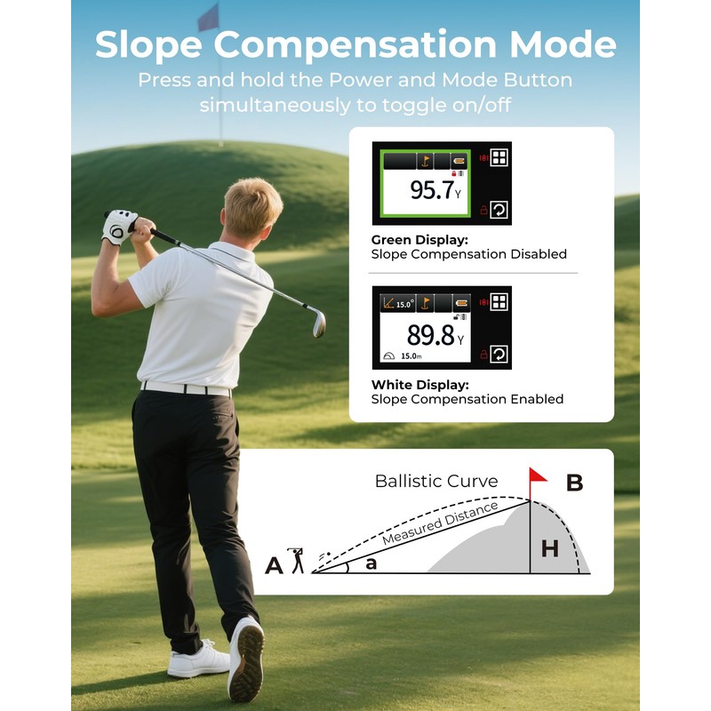 - Flaglock Vibration&Tournament Legal: CIGMAN golf range finder's flagpole-lock mode features vibration alert, automatically locking onto the flagpole even in cluttered environments. It also features slope compensation providing more accurate distance readings, especially on hilly courses. The slope switch makes it for Tournament legal play(press and hold the power and mode button simultaneously to turn slope off/on). It’s a smart pick for golf gifts for men or everyday golf accessories for men