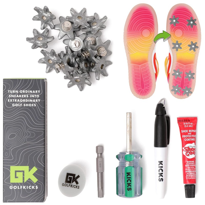 - GRIP 'N RIP CLEAT。 Golfkicksは足元に柔らかい感触で丈夫に作られています。 お気に入りの靴に取り付けて、快適でスタイリッシュにプレーしましょう。 キットの内容:クリート20個、トラクションマップ用マーカー1本、5mm 六角取り付けツール1本。