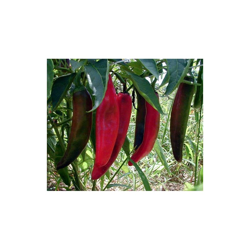 70 days. Capsicum annuum. (F1) Plant produces high yields of 7" long by 1 ½" wide Anaheim type hot peppers. Peppers are mildly hot, have thick walls, and turn from green to red when mature. Plant has green stems, green leaves, and white flowers. Excellent grilling variety. Also used fresh, stuffed, or roasted. This variety performs better than other Anaheim hot peppers. Does well under cool growing conditions too!