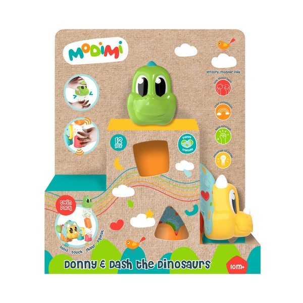 - Modular parts fit with other toys in the range, so Modimi keeps growing with your child - the Modimi Dinosaurs Set includes 1 Triceratops Head, 1 Brontosaurus Head, 3 Shapes Body Blocks, 1 Rattle Body Block, 1 Fabric Body Block, 2 Sets of Squeaker Feet, 1 Set of Feet, and 2 Tails