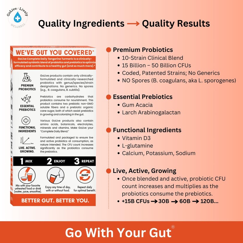 GoLive Prebiotic and Probiotic for Women, Men, Kids. Tangerine Turmeric Synbiotic Powder w/ L-Glutamine, Vitamin D3, Electrolytes. For Gut Health, Digestion, Metabolism, Immunity 15-50B CFUs.