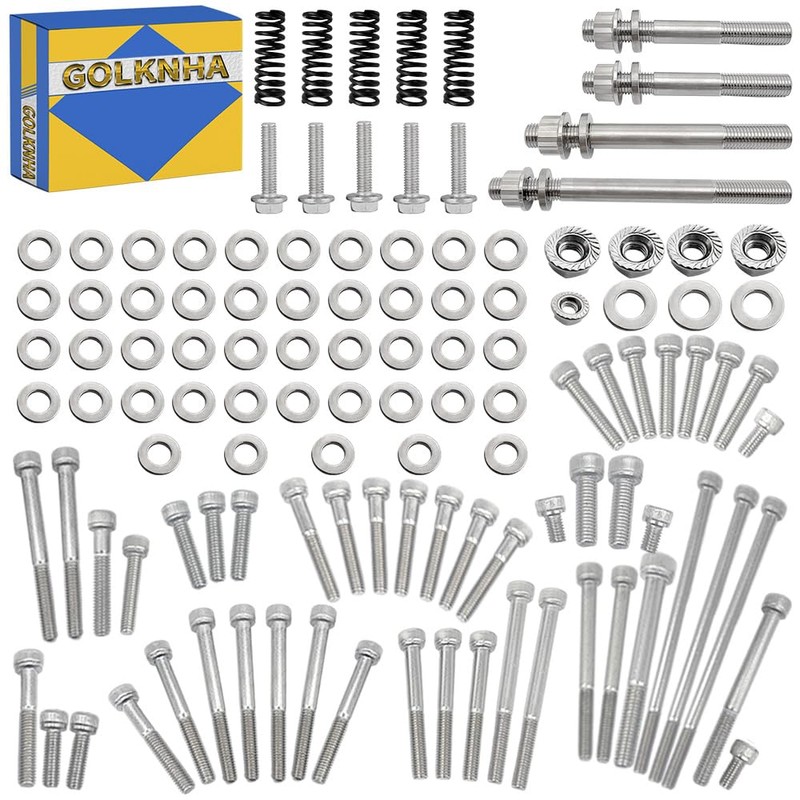- INCLUDED IN PACKAGE: Exhaust alloy bolts * 12, Right crankcase cover alloy bolts * 26, Left crankcase cover alloy bolts * 14, Sprocket cover alloy bolts * 6, Starter cover alloy bolts * 8, Oil filter cover alloy bolts * 4, Intake alloy bolts * 6, Cylinder head cover alloy bolts * 26, Clutch Screw * 5 (304 Stainless Steel), Clutch Spring * 5(Non Stainless Steel), Cylinder Head Studs * 4, Nut * 4, Washers * 4