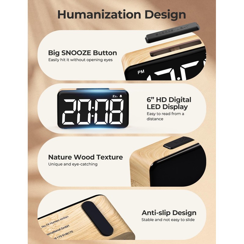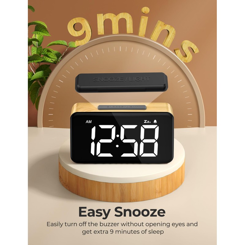 - 【LARGE SNOOZE BUTTON】Unlike other alarm clocks with small, hard-to-find snooze buttons, our big SNOOZE button of the digital alarm clock makes it simple to get a little more sleep in the morning. It allows you to say no to wake-up anxiety and easily get a nine-minute buffer time to start a comfortable day in the morning before your eyes are fully open!
