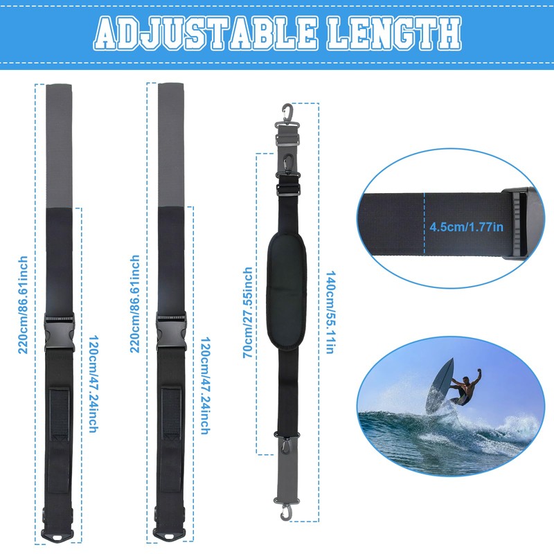 • Easy to use: simply attach the straps to both ends of the surfboard and adjust the length of the straps according to the size of the surfboard. Then connect the straps and straps to the carabiner, and you can adjust the length of the straps according to your needs. Whether it is a small and lightweight short board or a larger long board, it can be firmly attached.
