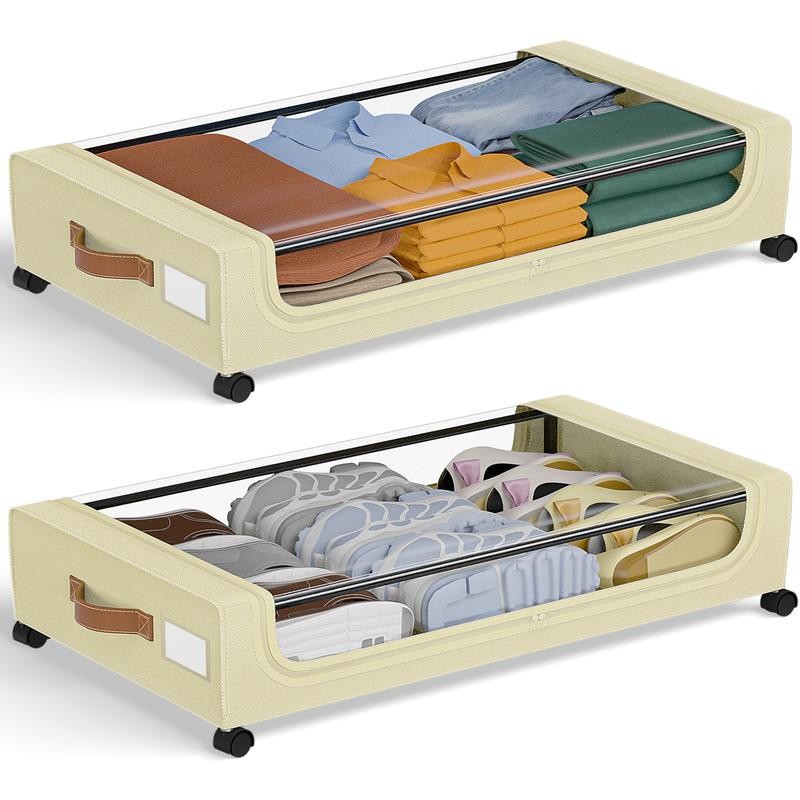 GoMaihe Under Bed Storage with Wheels: XXL 48L Rolling Underbed Storage Containers with Lids - Space-Saving Easy Pull-out Grey 2-Pack - Color: Cream, Number of items: 2-pack