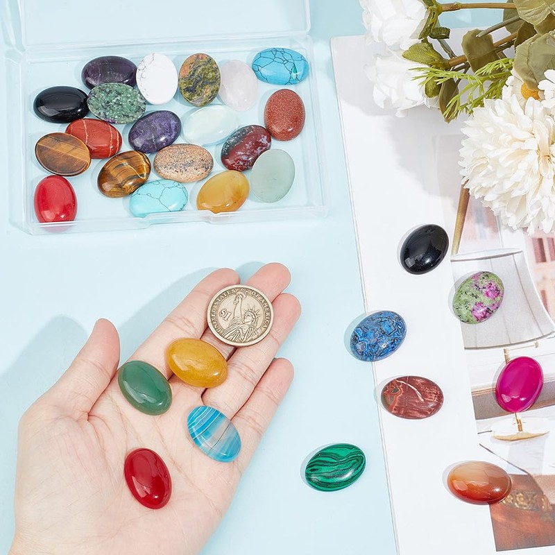 Oval cabochons: approx. 17~19 mm wide, 24~26 mm long, 6~10 mm thick, 30 types, 1pc / style, 30 pieces.