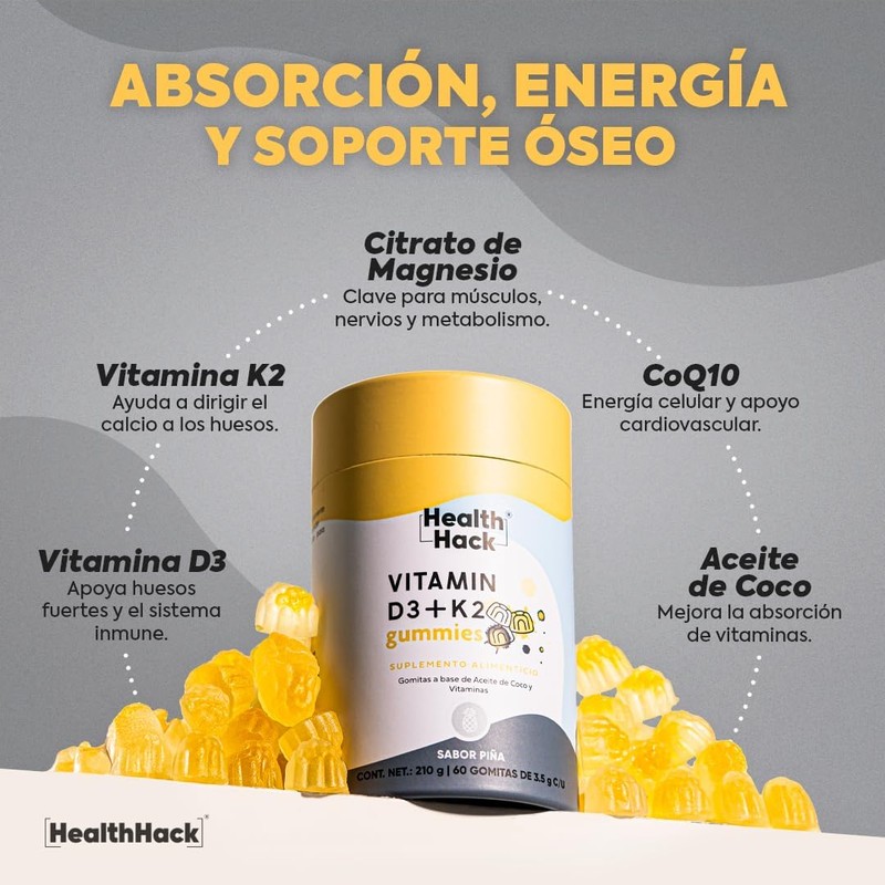 Gomitas de Vitamina D3 400 UI + K2 sabor Piña | 60 gomitas para 1 mes con Aceite de Coco, Citrato de Magnesio, Q10, Ingredientes Naturales, Formula Vegana Sin Azúcar | Health Hack