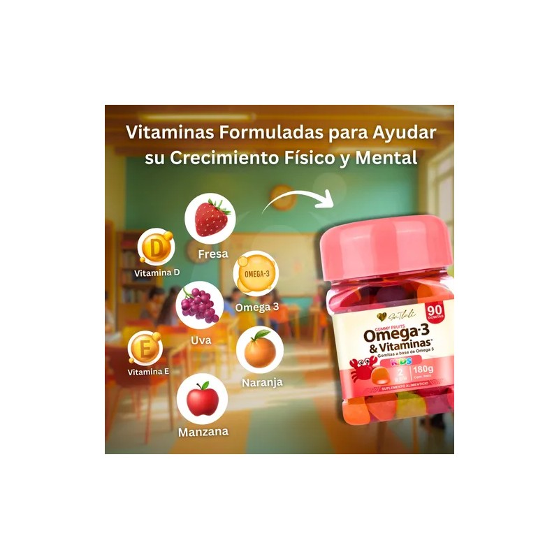 Con 90 unidades por envase, cada gomita proporciona una dosis equilibrada de Omega 3, Vitamina E y Vitamina D, contribuyendo al bienestar general de los niños.
