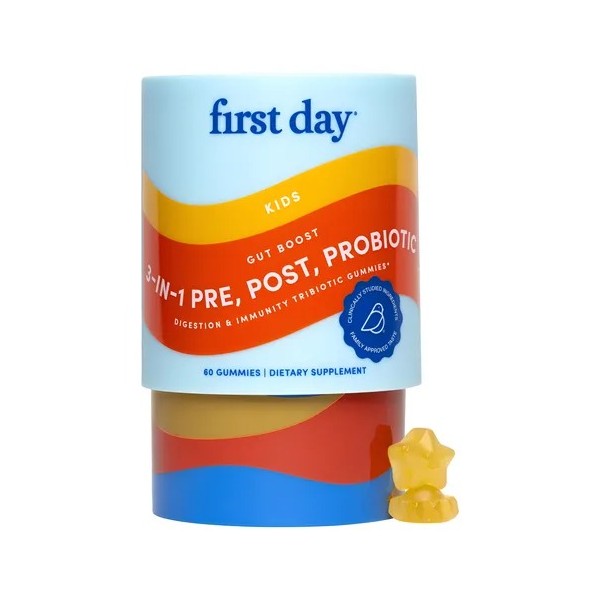 - Gomitas Probióticas 3 en 1 para Niños FIRST DAY Prebiótico + Probiótico + Postbiótico Apoya Salud Digestiva y Bucal, Función Inmunológica y Niveles de Energía Suministro para 30 Días