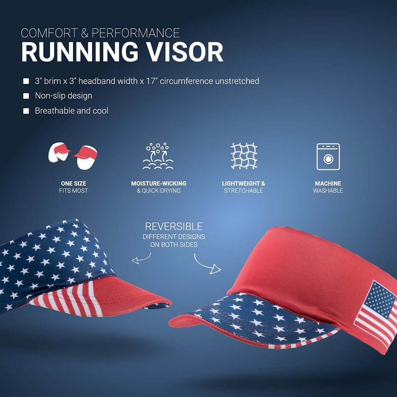 - HIGH QUALITY, HIGH PERFORMANCE! Our patriotic running comfort performance visor is great for all sports including: running, hiking, golfing, playing tennis, or even just relaxing. This one size fits most visor features a 3” brim as well as a 3” headband. The moisture wicking and quick drying fabric of this visor helps keep the sweat out of your face as well as shield your eyes from harmful UV rays or constant driving rain.