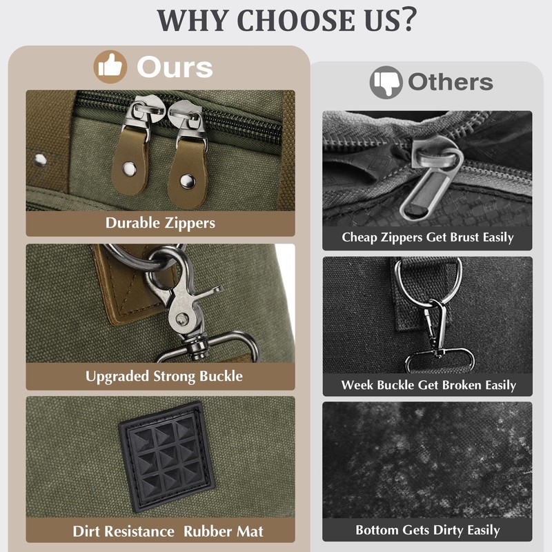 - Multipurpose: Suitable for both men and women, the Canvas Travel Duffel Bag can be used as a weekender bag, overnight bag, short-term travel bag, toiletry kit, camping bag, business bag, gym tote, carry-on luggage, or simply as an emergency bag