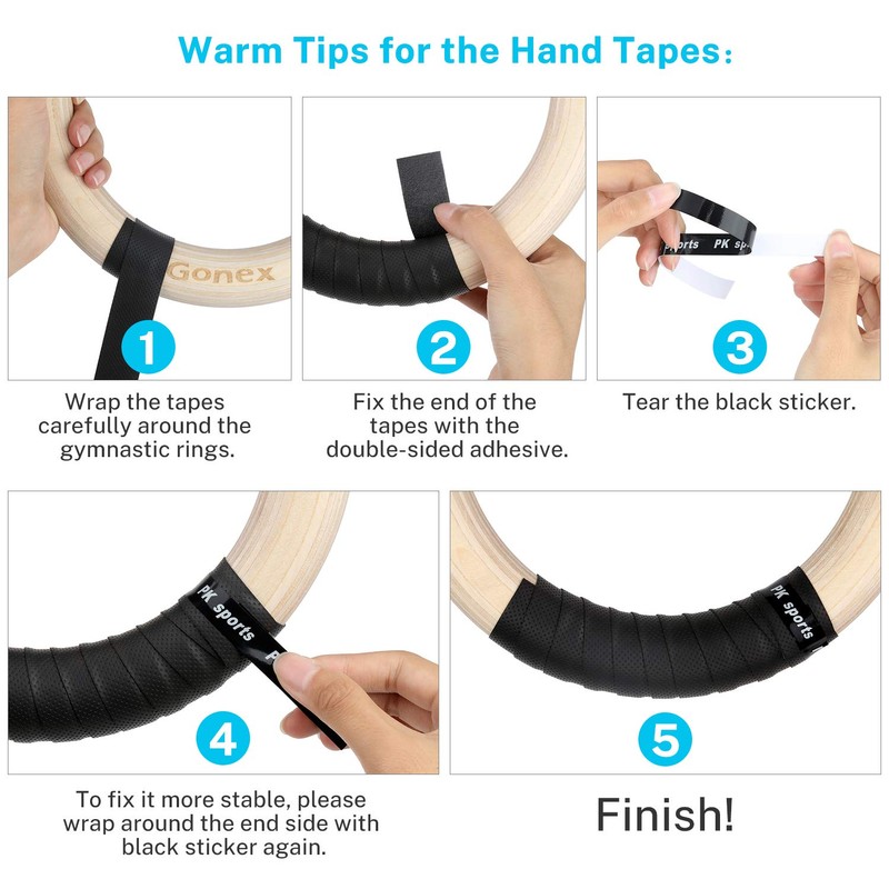 • 【Easy Installation】 As shown in the instruction, it’s very clear and easy to install the Gymnastic Rings. Attention: 1) To fix it more stable, please tear the black sticker and wrap around the end side with it again. 2) For your safety and outstanding performance, we strongly remind you to lock the carabiner properly before training.